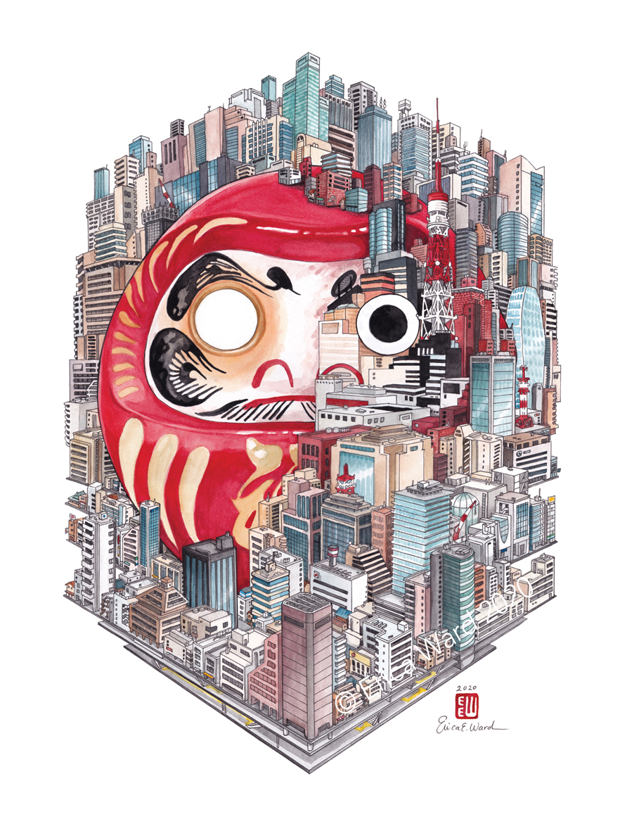 "Engimono: Daruma," Erica Ward watercolor design is makes an eye-catching poster and memory of the detail of the Tokyo metropolis.