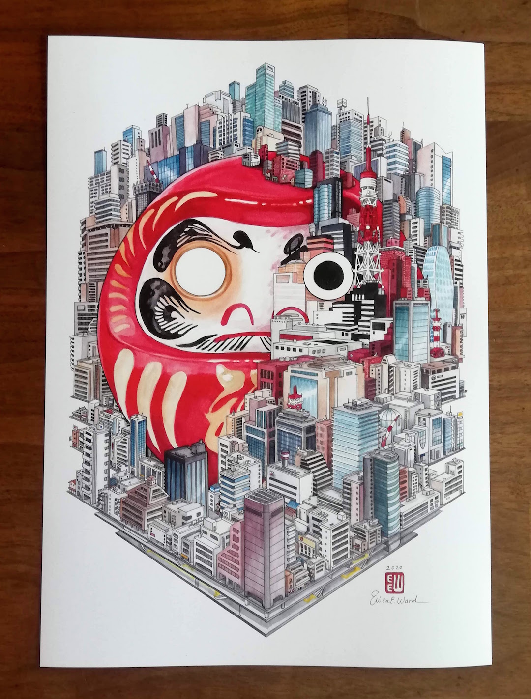 An imaginary slice of Tokyo, protected by a giant Daruma doll -- one eye painted to represent a wish made, the other left blank waiting for the wish to come true. He watches diligently yet also blends into the cityscape. Perhaps in some way the city itself is our protector and bringer of luck.