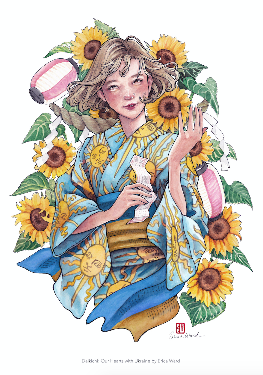 The print is A4 size, on 195 kg stock paper. 100 signed prints are available of this special edition that includes a yukata obi in the colors of the Ukrainian flag.