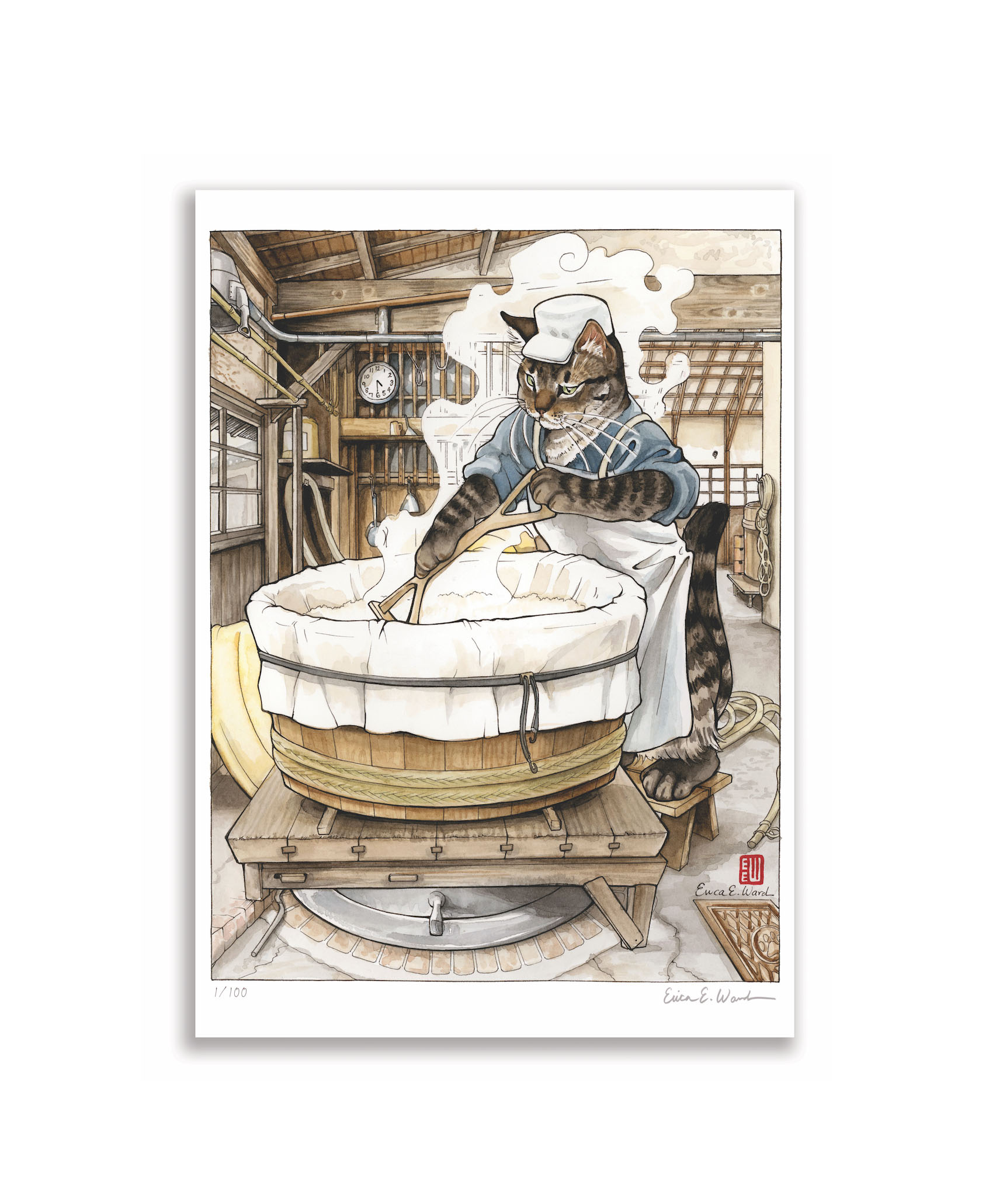 This artwork print depicts sweet little Jun, already working hard at 4:30am to steam the rice for sake releases with a determined grin.
