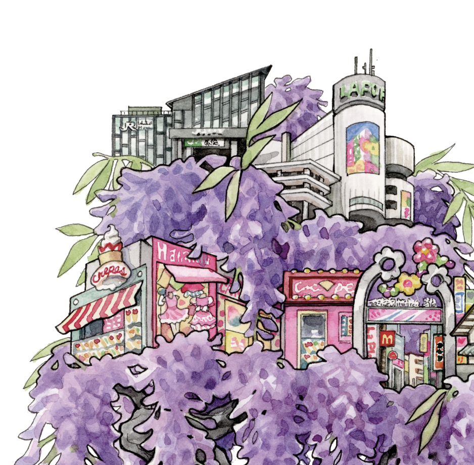 Harajuku overflows with colorful signage, fluffy pink fashion, and the trademark crepes. Though the old station has now been deconstructed, I depicted both the old and the new, appreciating what is both lost and gained with change. The purple of a blooming wisteria bonsai complement this vivid and bright neighborhood.