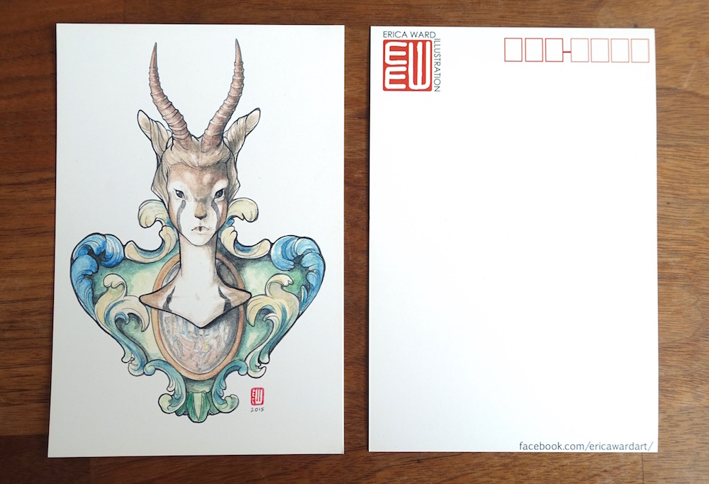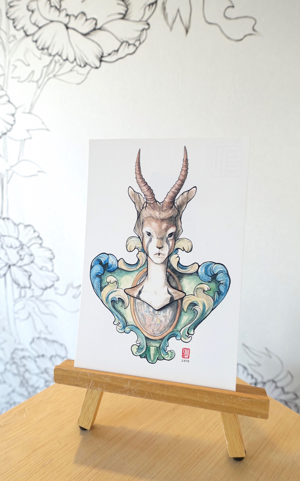 "Carousel Gazelle" design 4.25"x5.6" postcard, glossy finish.