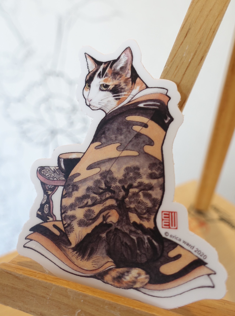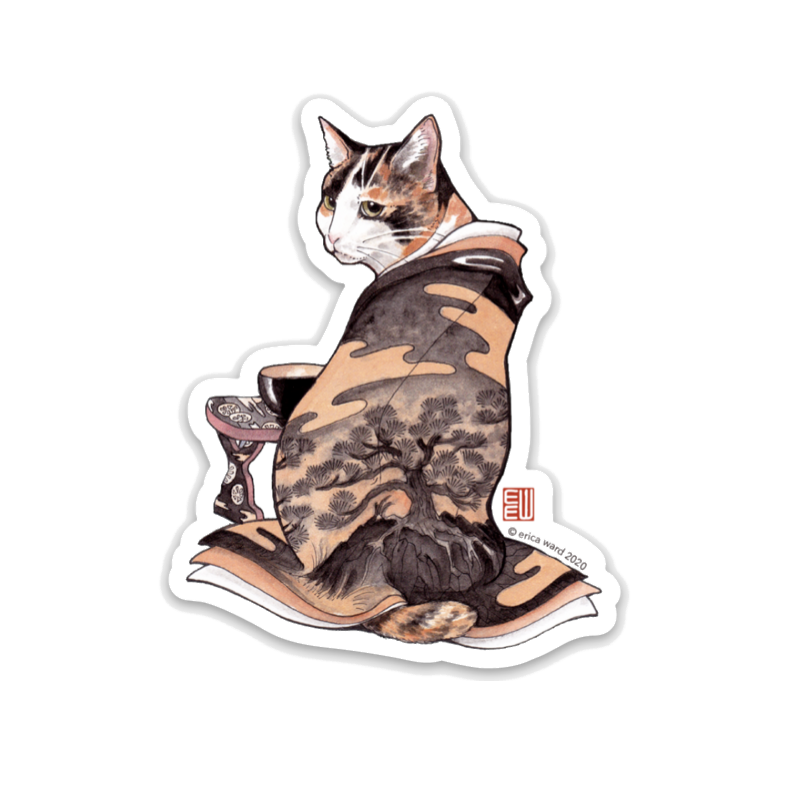 Knowing only a rich life, the maiden dines in her finest silken kimono. Does the calico-colored pattern on the cloth match the pattern on the fur of the kitty wearing it? Watercolor and pen artwork modeled after Tokyo rescue cat, Otome, and her luxurious fur pattern.