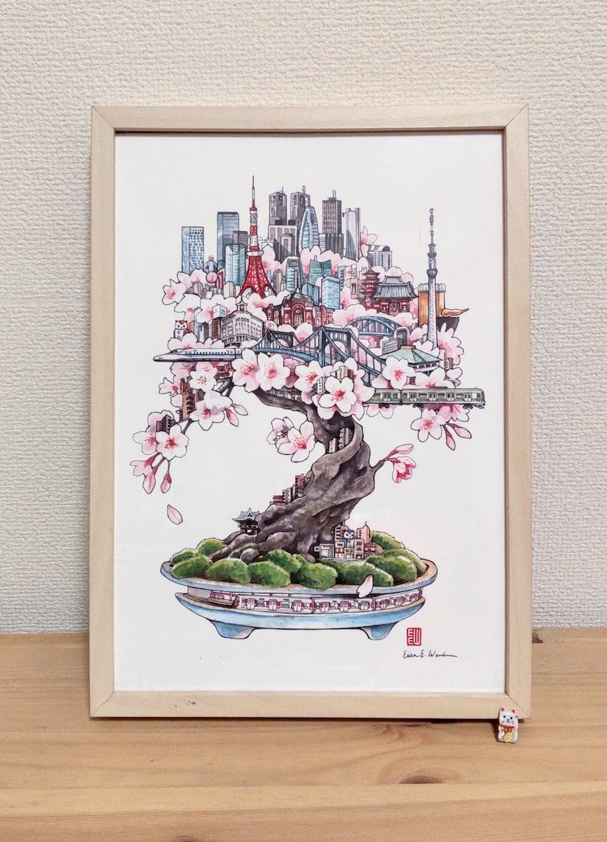 Original Erica Ward Illustration watercolor design "Tokyo in Bloom" in A4 (210x297mm) print.