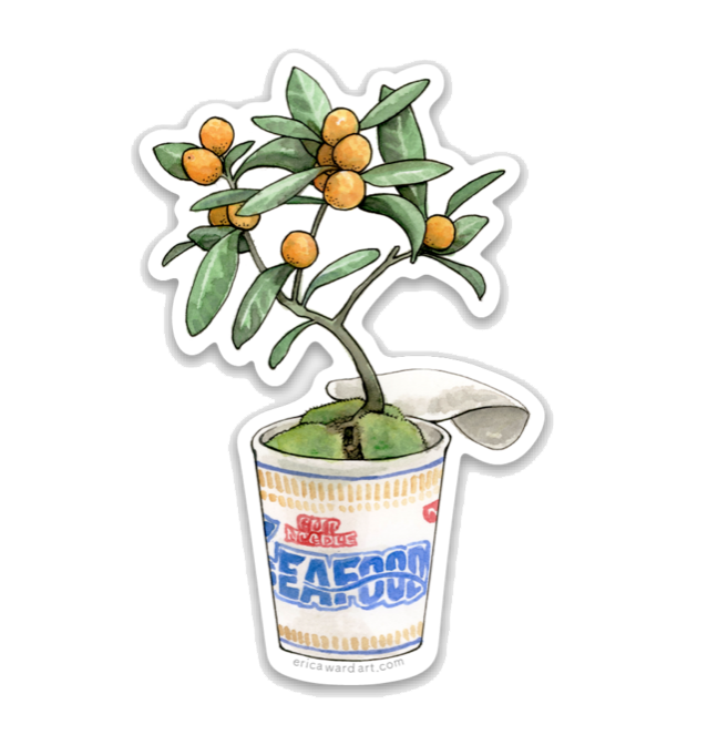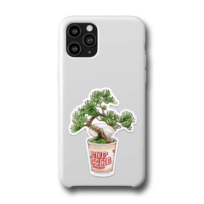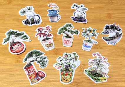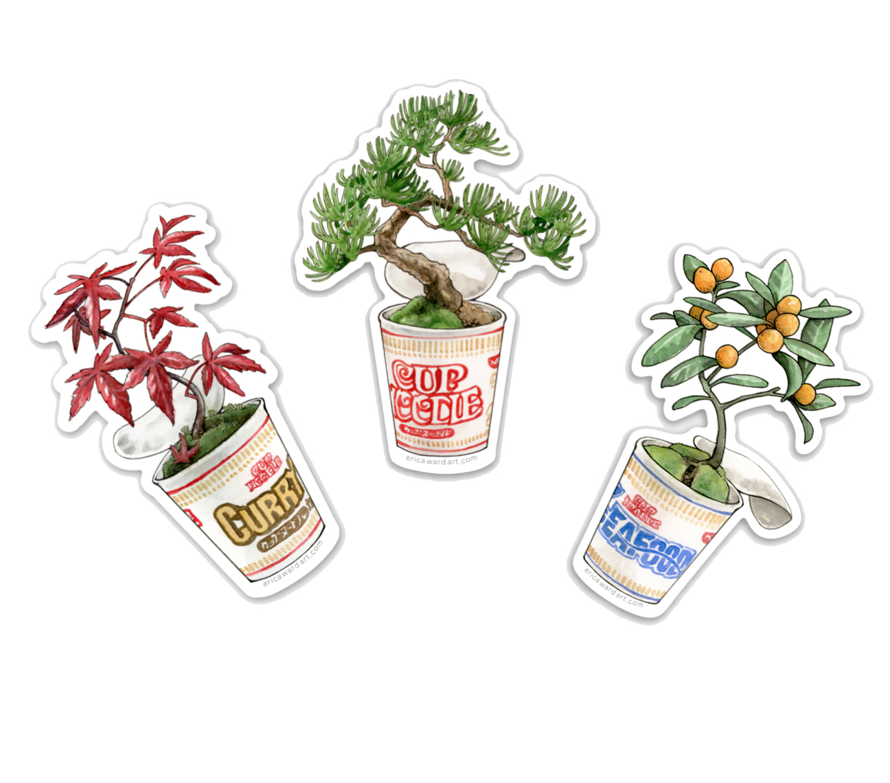 Three sticker set of bonsai potted in beloved instant noodle cups.