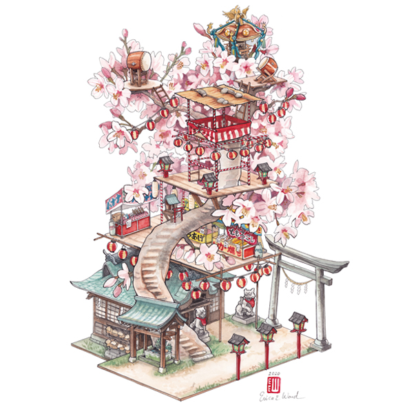 Original Erica Ward Illustration watercolor design "Engimono Bonsai: Sakura" in A4 (210x297mm) print.