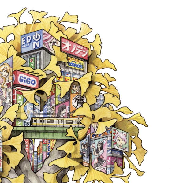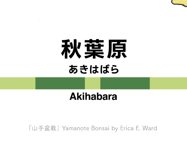 Original Erica Ward Illustration watercolor design "Yamanote Bonsai: Akihabara" in A4 (210x297mm) print. Unsigned, open edition.