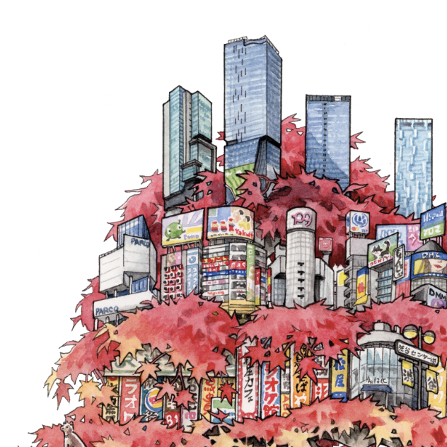 Before you know it, Shibuya is populated with brand new sky scrapers, stretching up beyond the chaos of Center Gai nightlife. These past few years Shibuya has undergone major change. To represent that season of change I depicted Shibuya as a momiji maple changing colors.