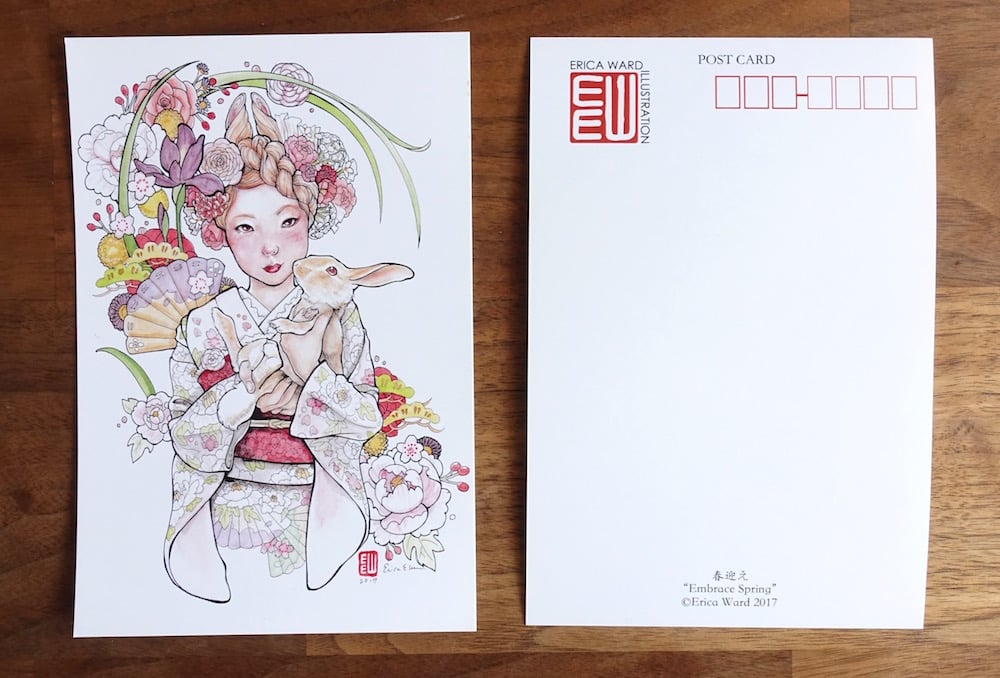 "Embrace Spring" A lacey, light kimono and a pair of rabbit-souled friends celebrate spring with in this soft pen and watercolor design.