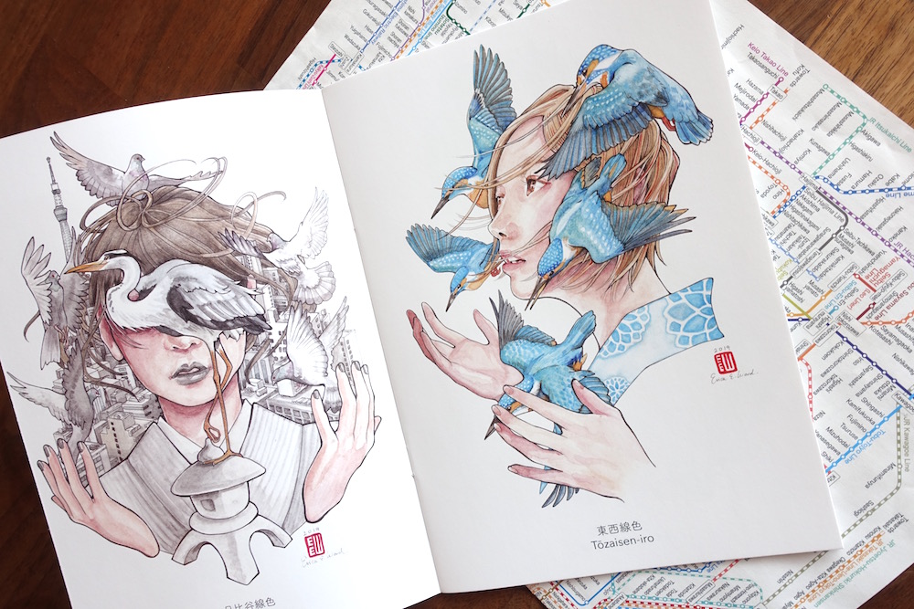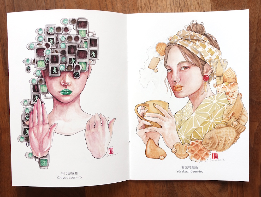 This “bijin-ga” portrait illustration pairs objects and beautiful faces with the colors of each of the thirteen Tokyo underground train lines, giving new character to the familiar colors of our Tokyo-acquired visual language.