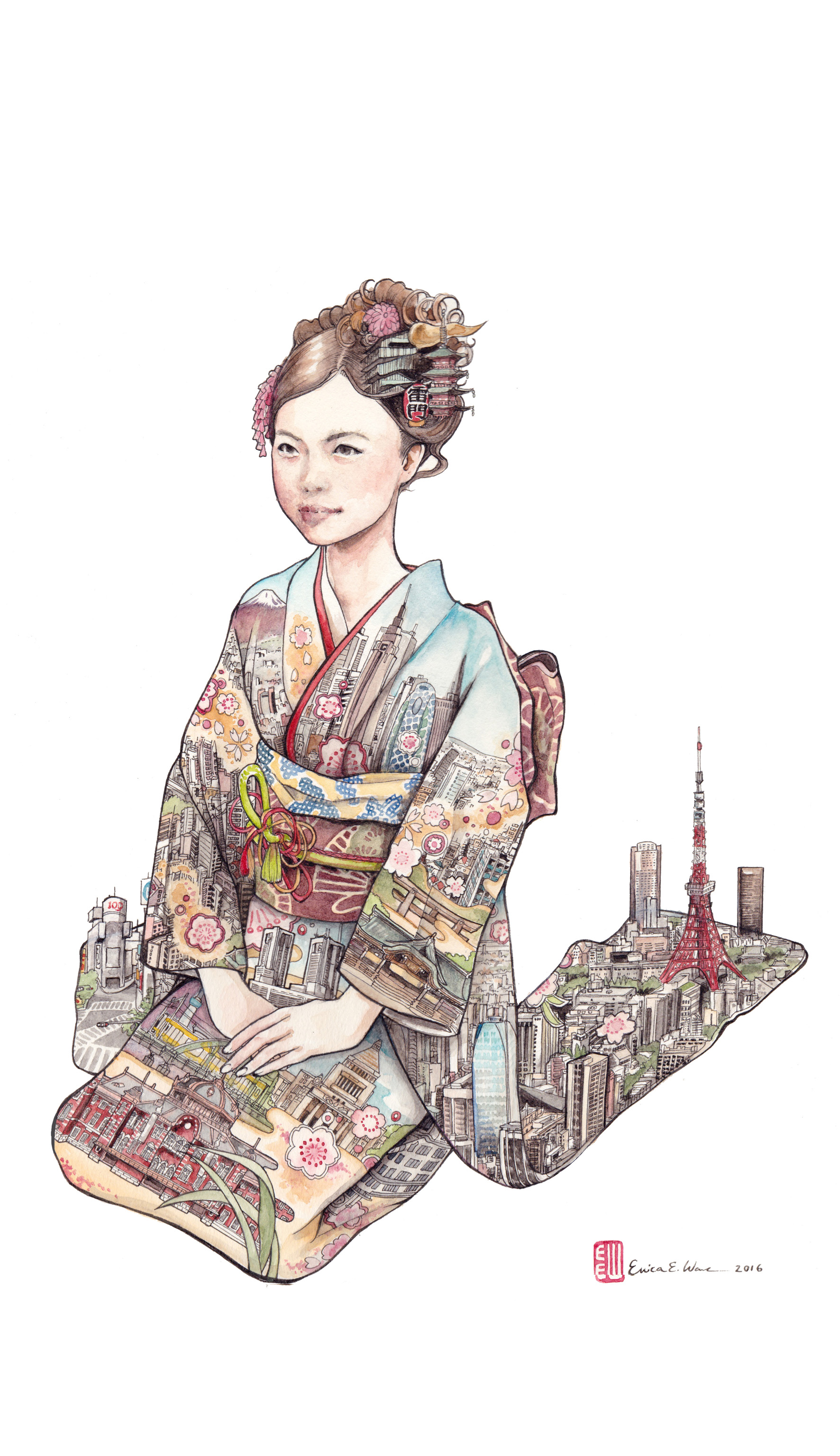 The city of Tokyo spreads out in a beautiful furisode kimono in this Erica Ward watercolor illustration, "Wear the City." Landmarks of the Metropolis can be spotted throughout.