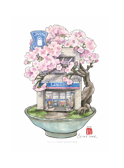 In this print, a blooming yaezakura bonsai tree shades a Lawson convenience store in a light-blue ceramic pot.