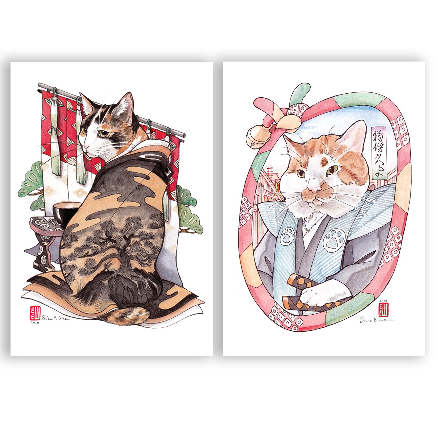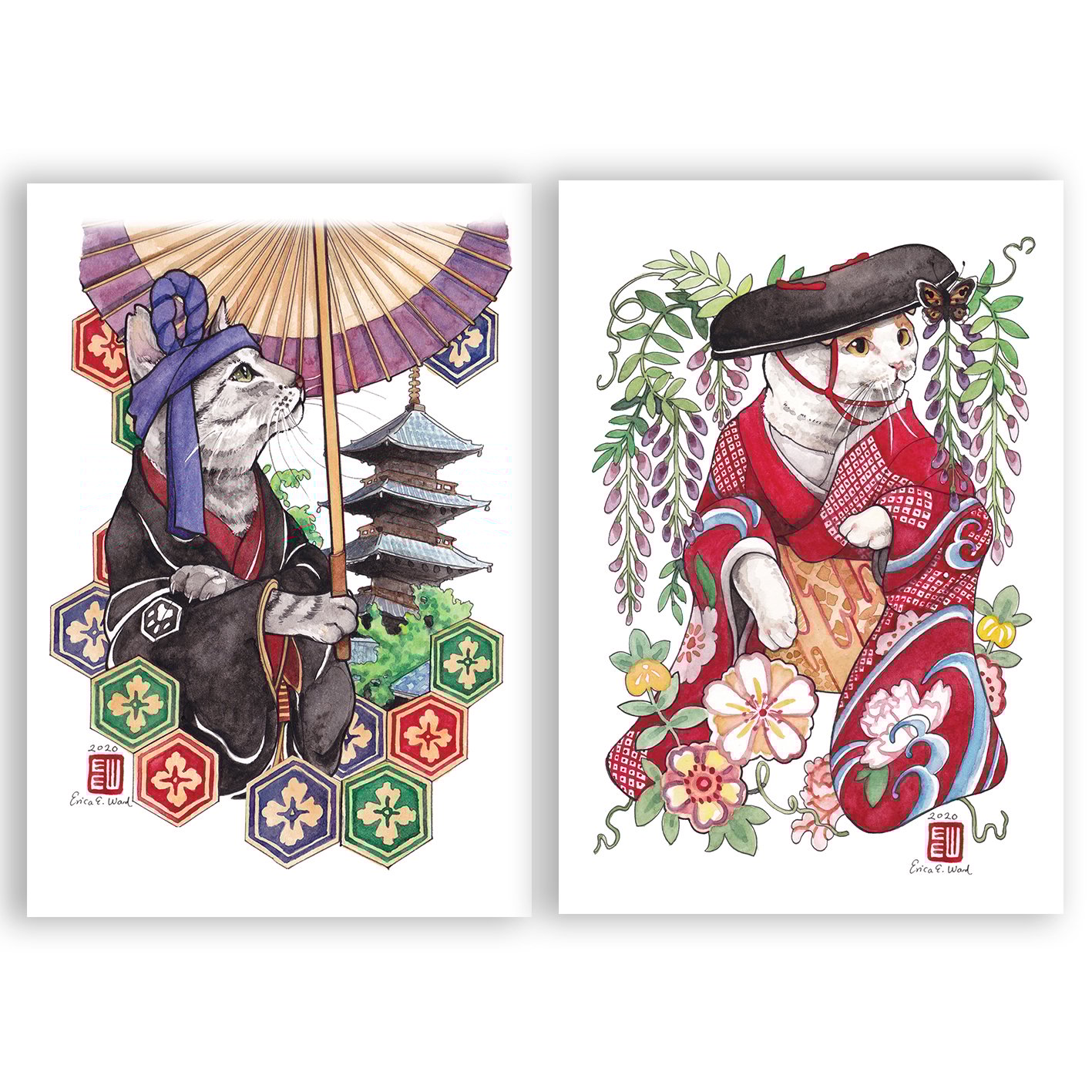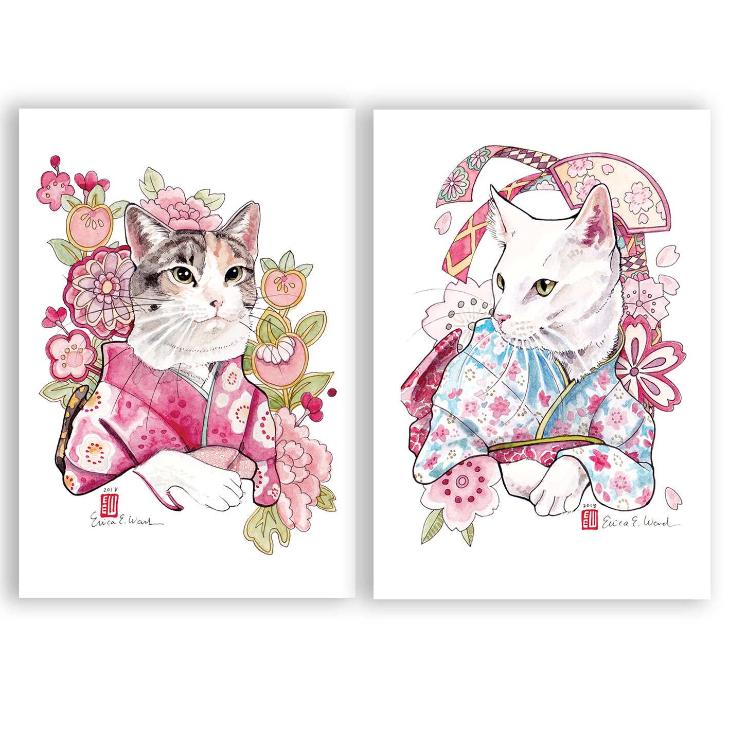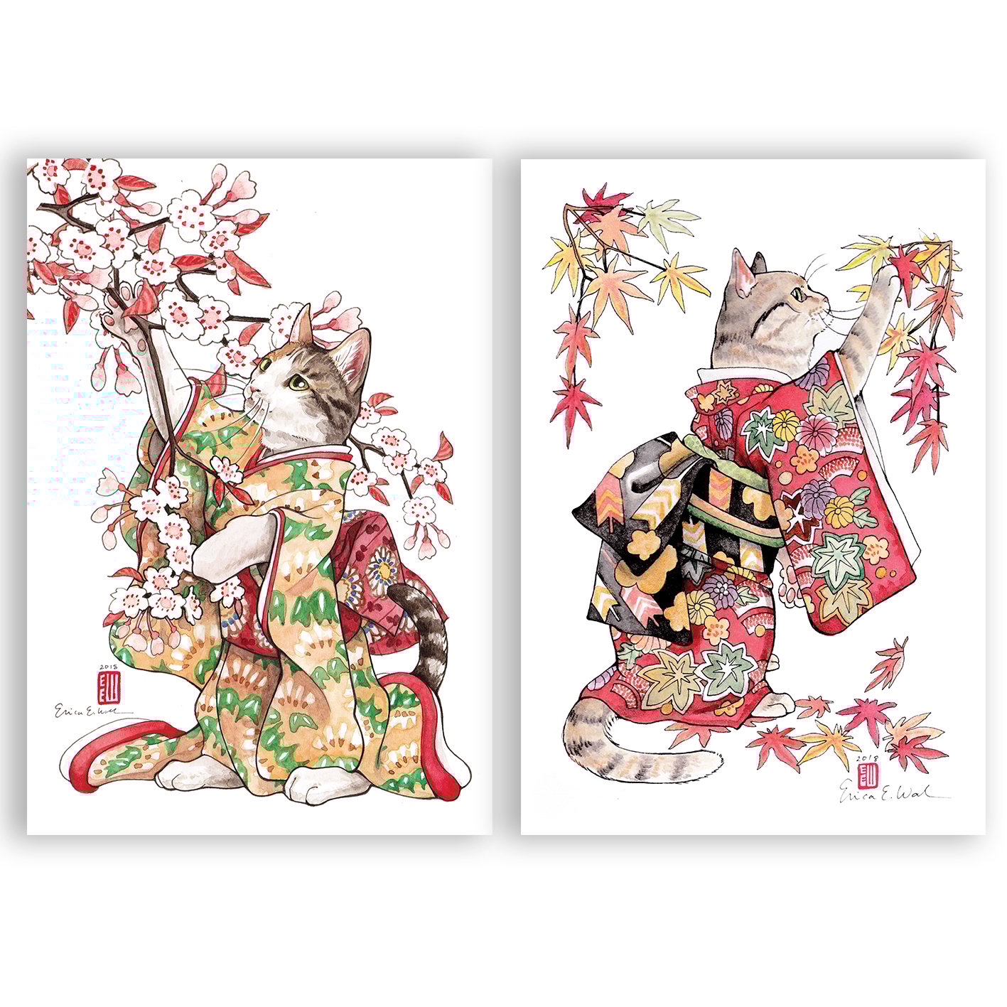Eight postcards of cats in Kimono showing their dignity and cuteness.