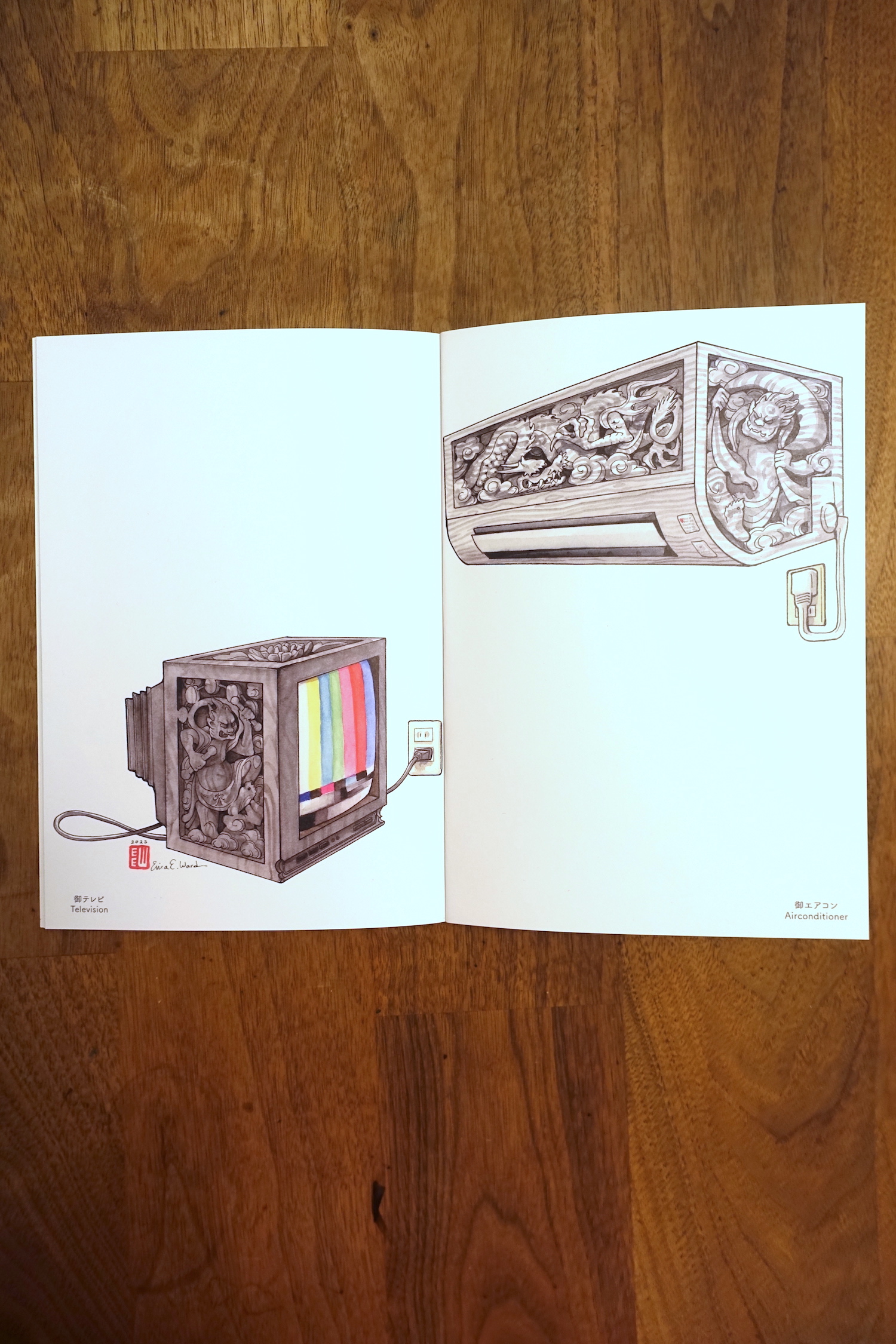 Miyabori are the intricate wood carvings seen on the pillars and walls at shrines and temples. I always marvel at the craftsmanship of these carvings, and the dynamic shapes often inspire my urge to draw. When I look at miyabori, I start to imagine what the world might look like if the same respect and attention were given to other objects. What if we adorned the things that we rely on every day and yet to which generally give little thought? I wanted this series to be both playful and inquisitive in using miyabori motifs to ask the viewer to contemplate the value of objects that we may take for granted in our daily lives.