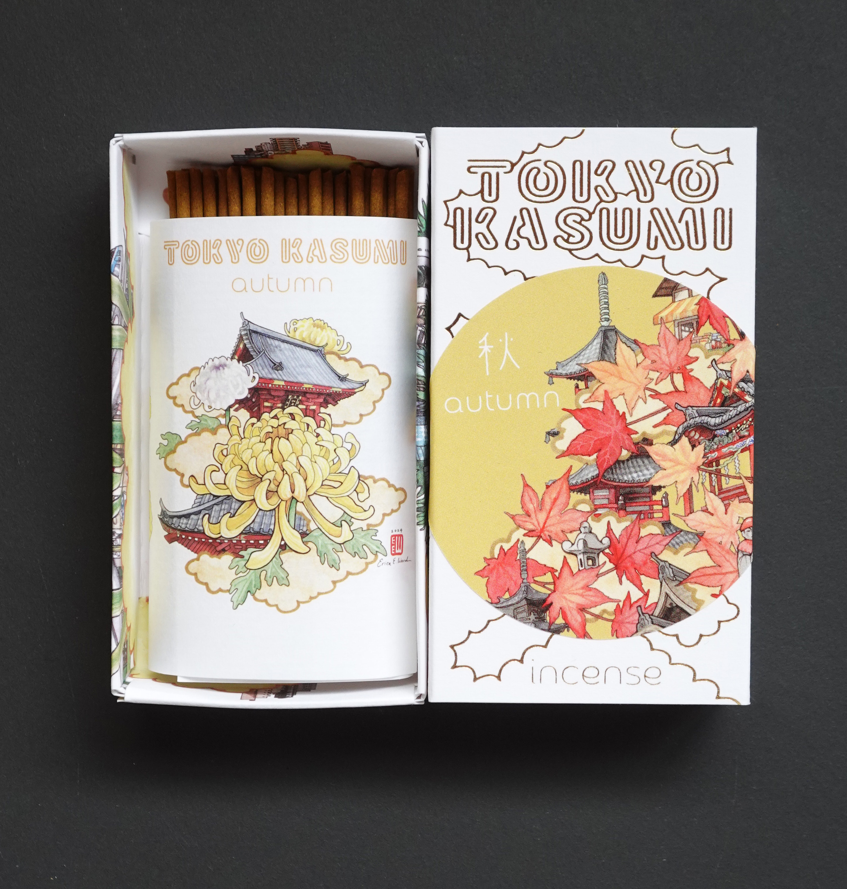 "Tokyo Kasumi" is a collaboration art + fragrance project between Perfumer Ko and Artist Erica Ward. Perfumer Ko crafted four incense fragrances based on the four seasons in Tokyo and Ward was inspired by these fragrances to created the illustrations for this series. Each illustration combines seasonal imagery with slices of Tokyo urban scenes. “Kasumi,” which means “mist” in Japanese, is a motif that appears in classical Japanese painting. The flat, cloud-like pattern is often white or gold and the kasumi shapes create visual breaks between story scenes on rolling scrolls, or serve as dividers between foregrounds and backgrounds in paintings with flat perspective. In the paintings for Tokyo Kasumi, we drift between seasons and scenes as a kasumi clouds blend together with architectural and floral visuals while also representing the swirling smoke of fragrant incense.