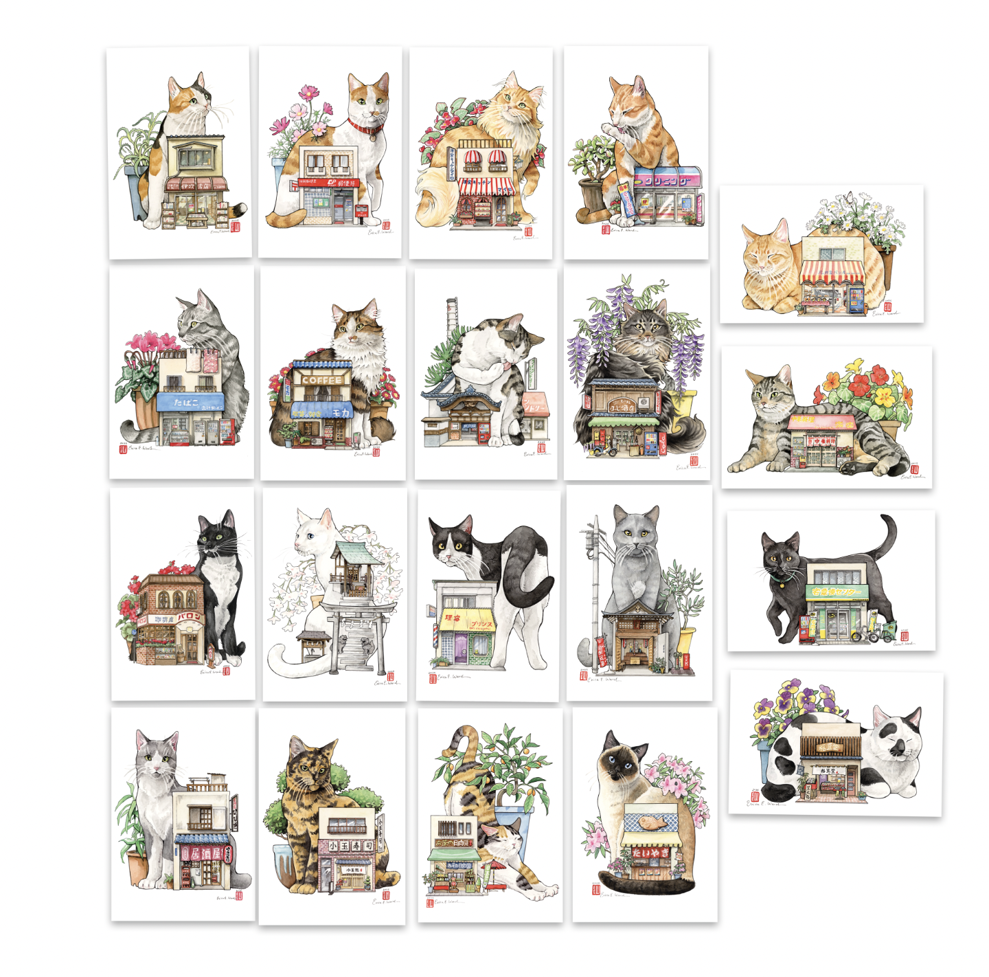Five postcards of cute tabby cats together with nostalgic Japanese storefronts from Erica Ward's "nekomachi" series.